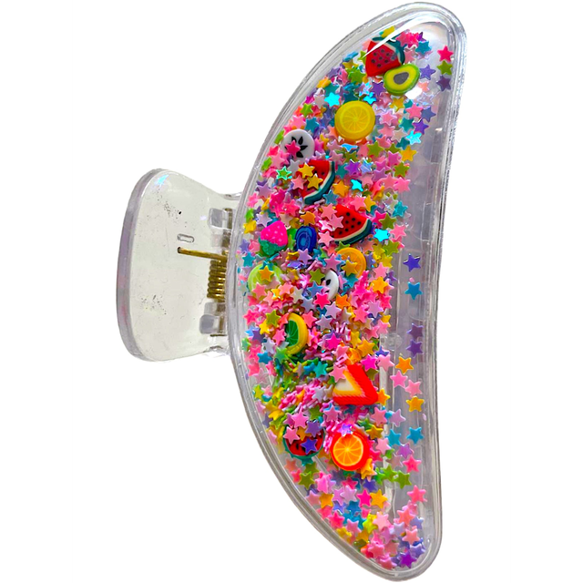 Transparante kunststof haarclip, met feestelijke glitter pailletten gevuld.